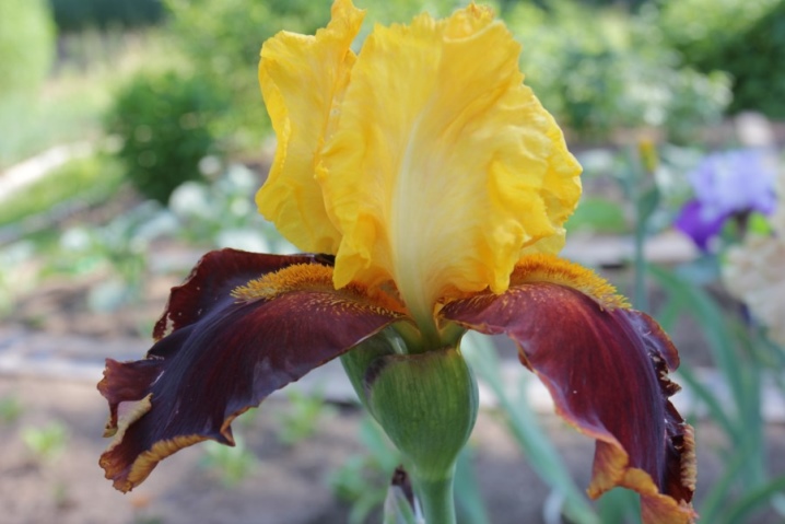 1. Яркий и контрастный окрас: Привлекательное сочетание бордового и желто-оранжевого цветов делает этот ирис настоящим украшением цветника.