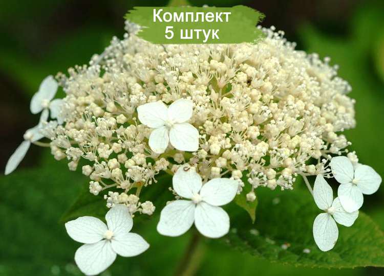 Цветет с конца июня до середины сентября, издавая тонкий, едва уловимый аромат, который привлекает бабочек. Соцветия белые, крупные, диаметром 15-25 см, имеют купольную форму и напоминают кружевную шапочку. В центре соцветия мелкие кремовые цветочки с зеленоватым оттенком, окруженные более крупными белыми бесплодными цветами. Плоды появляются в октябре и представляют собой маленькие коробочки размером 2-4 мм. PH почвы не влияет на цвет.