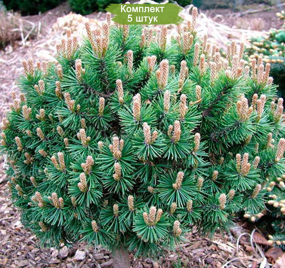 Комплект из пяти саженцев Горной сосны размером от 20 до 40 см предлагается по привлекательной цене: пять растений по стоимости четырех. Горная сосна пользуется большой популярностью среди садоводов и ландшафтных архитекторов благодаря своим компактным размерам и способности прекрасно вписываться в любые цветниковые композиции. Это растение сохраняет свою зеленую окраску круглый год и радует приятным ароматом.